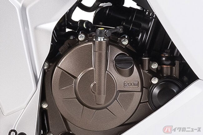 搭載される排気量249ccの単気筒SOHC4バルブエンジンは、冷却方式にスズキ独自の油冷システム「SOCS(Suzuki Oil Cooling System)」を採用しています。これは、エンジンの燃焼室周りにオイルジャケットと呼ばれる冷却回路を設け、潤滑とは独立した回路でオイルを循環させることでエンジンを冷却する方式です。オイルクーラーで冷やしたオイルを直接オイルジャケットに高速で通すほか、オイルジャケット内に設けられた「バウンダリーレイヤーブレーカー」と呼ばれる突起がオイルの流れに変化を与え、冷却効率を高めています。