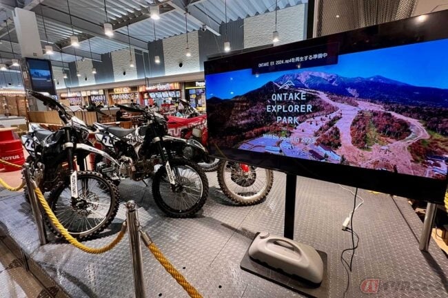 また、オフロード系バイクの展示とともにオフロード走行が楽しめるフィールド「ONTAKE EXPLORER PARK」のPR動画が流されていました。立ち止まって見学するライダーの姿も見られ、こうした展示があることで、来場者全般にバイクへの関心を高めるきっかけになるかもしれないので、バイク乗りとしては嬉しい限りです。