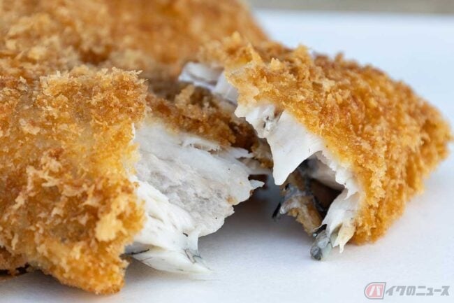 それでは、揚げたて熱々の「大きなアジフライ」をいただきます。揚げ色は綺麗なきつね色で、衣は粗めのパン粉でサクサク、厚みのある身はフワフワ!