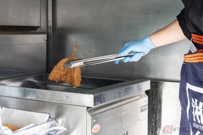 この日は取材ということで、小田原漁港の敷地内で特別にキッチンカーを営業状態に展開し、さっそくアジフライを揚げていただきました。