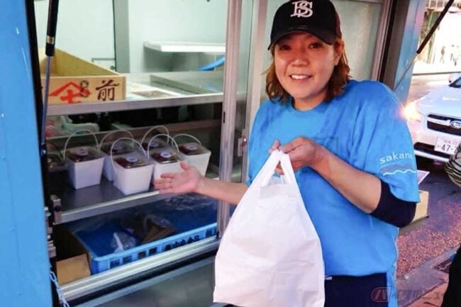 小田原漁港に到着すると、鮮やかなブルーのキッチンカーがアジフライののぼりを立てて停まっています。バイクを降りるととても朗らかな女性がキッチンカーから現れました。「湘南魚類」代表の土屋彩乃さんです。