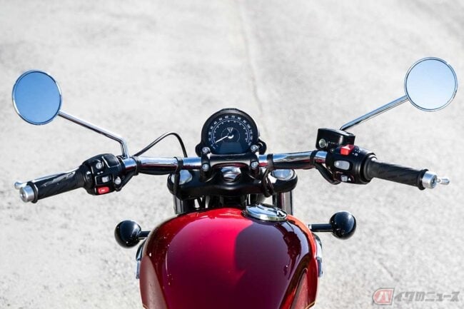 身長165cmと小柄な筆者(小川勤)の場合、ステップは少し前すぎる感覚もありますが、大型アメリカンクルーザーほどではありません。取り回しも引き起こしもクルーザーとしては軽く、扱いやすいのが魅力です。