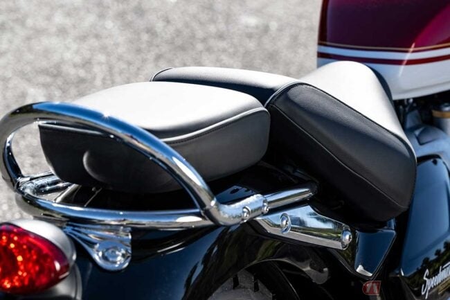 また、ワイド化された新設計のシートは、厚みもあって長距離の移動を快適に過ごせることでしょう。これはパッセンジャーシートも同様です。「ボンネビル・スピードマスター」のリラックスするためのエルゴノミクスは、疲労感を軽減し、それがタイムレスな存在感はそのままに、充実した電子制御と完璧なマッチングを見せるのです。