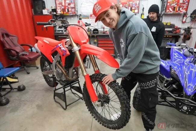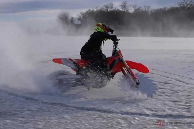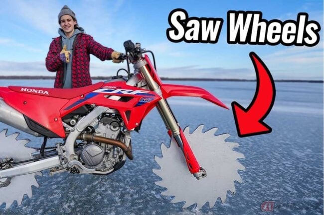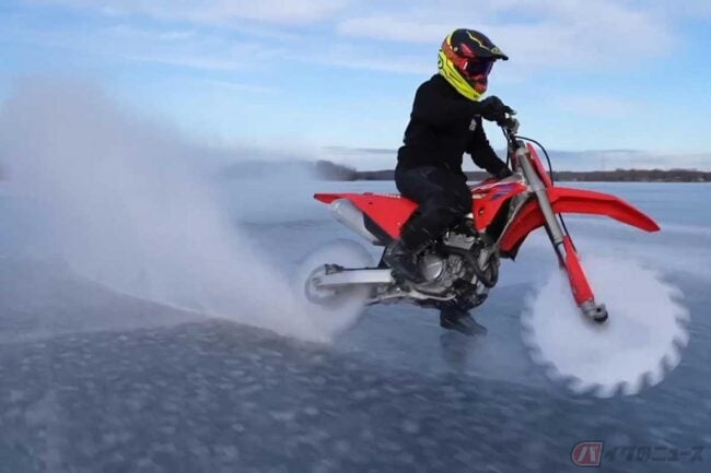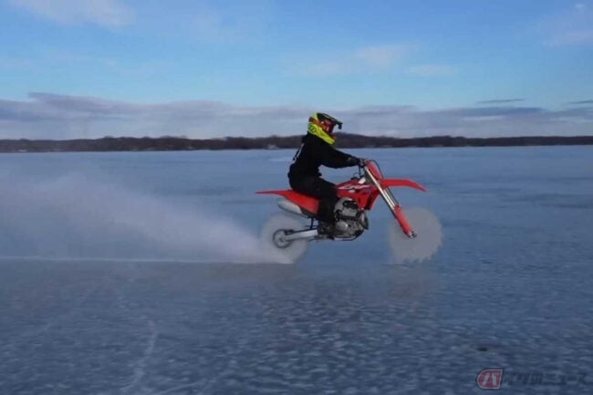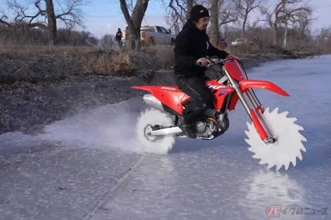 魔改造「ギザギザ」ホイールのホンダ「CRF250R」で氷上を大爆走(超危険)!? アメリカのパリピ系YouTuberに世界中が大注目!!