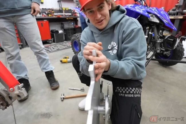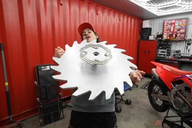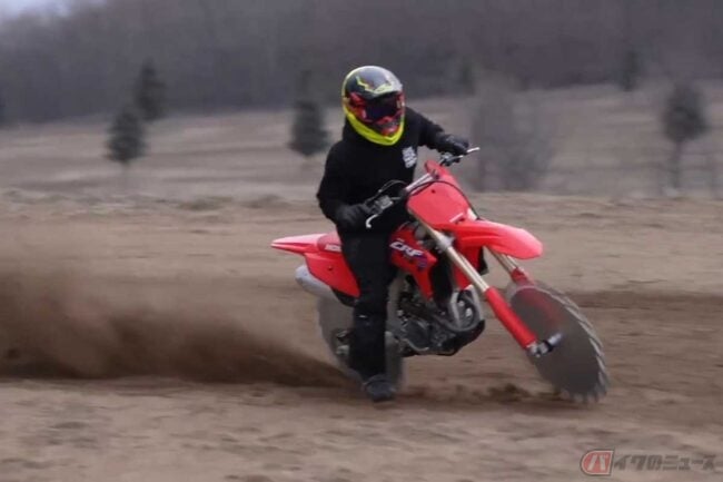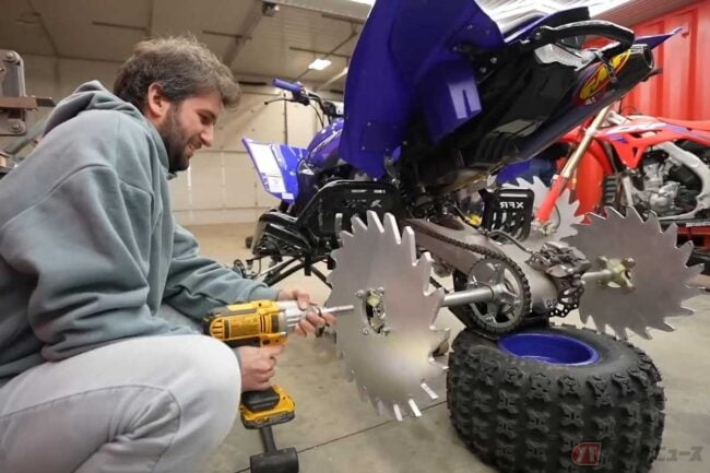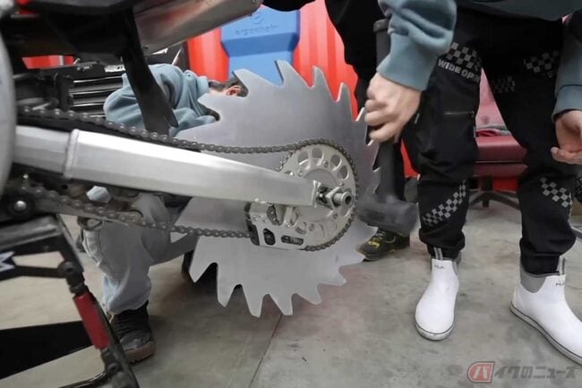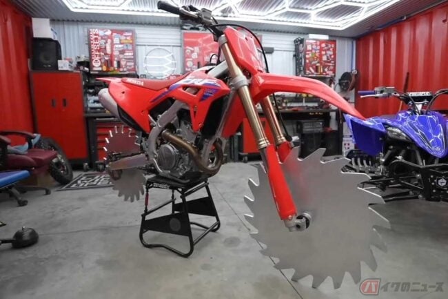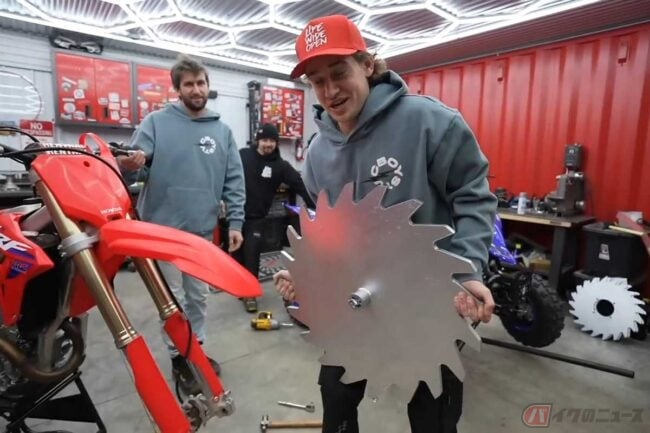 ベースはホンダ「CRF250R」で、言わずとしれたモトクロス・エンデューロ競技車両です。動画が始まるやいなや、メンバーが重そうに持ち上げたのは丸形のノコギリ!?