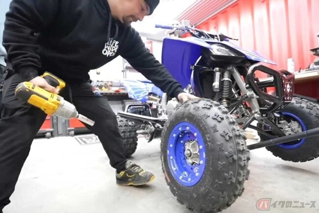 そんなことには一切触れず、黙々と前後の標準ホイールを取り外して丸ノコホイールに換装。オマケに隣に置かれたATVも同じように換装しています。