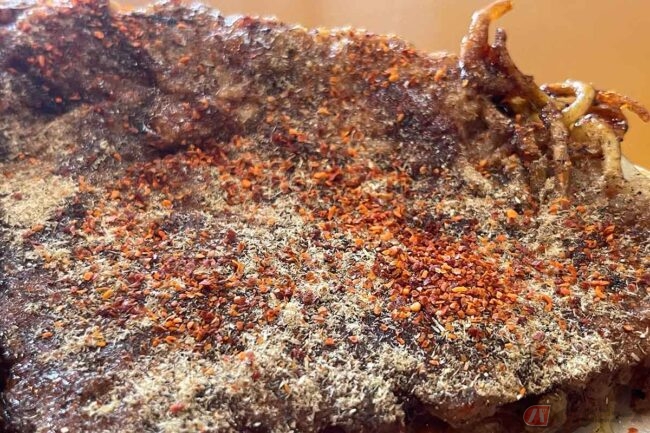 富士宮焼きそばの麺は、市内4カ所の製麺所の麺を使うのがルール。一般的な焼きそば麺は「茹で→蒸し」ですが、富士宮麺は蒸し工程なし! だからあの独特の歯ごたえとモチモチ感になるんです。さらに肉かす(ラードを絞った後の副産物)と、だし粉を使うのも特徴。