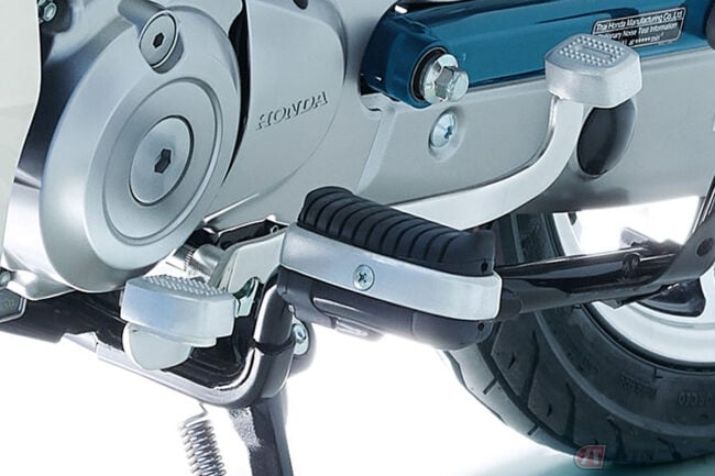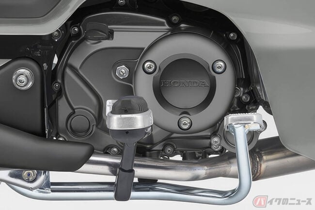 変速機構には、ペダルを踏み込むだけで変速できるスーパーカブ独自の自動遠心クラッチと4段リターン式変速を採用しています。走行中はリターン式で、停車時のみロータリー式になるこの機構は、ドラムベアリングやシフトアームラバーなどにより、スムーズで静かなシフトフィーリングを追求し、変速時の振動や音も軽減されています。
