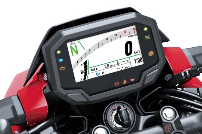 インストゥルメントパネルは、ハイコントラストのフルLCDメーターを採用。バースタイルのタコメーターやギヤポジションインジケーターなど、カワサキオリジナルフォントで走行時の視認性を高めています。さらに、スマートフォンアプリ「RIDEOLOGY THE APP MOTORCYCLE」と連携することで、ナビ機能や音声コマンドの利用も可能です。