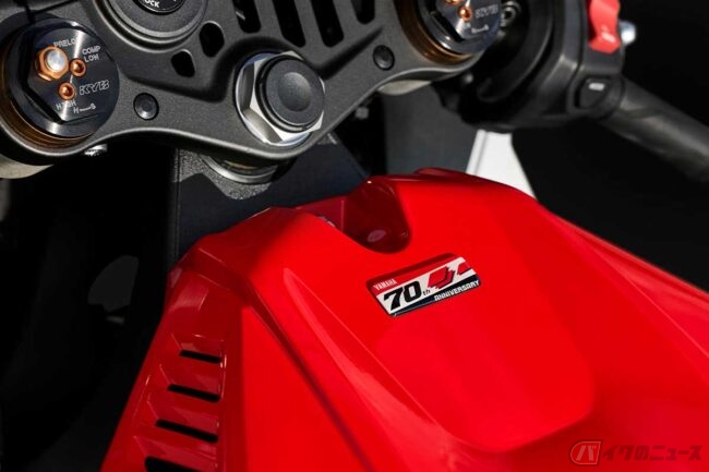 またライディング中に常に目に触れる燃料タンクの天面には「70周年記念エンブレム」が、タンクの側面にはファクトリーマシンのような「ゴールドのヤマハ音叉エンブレム」が配置されています。