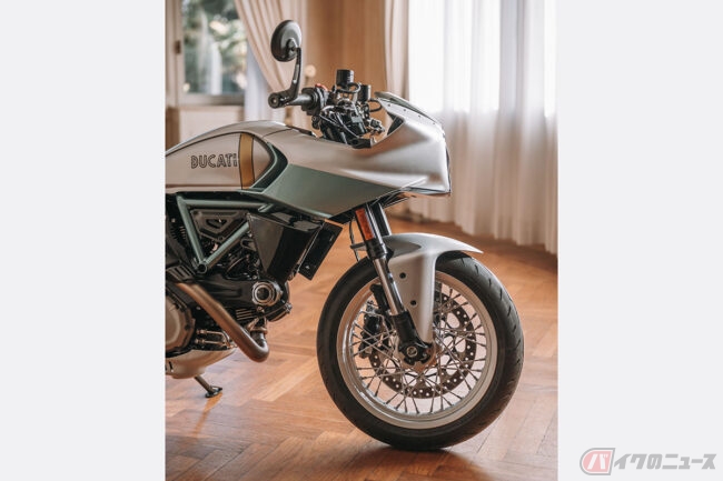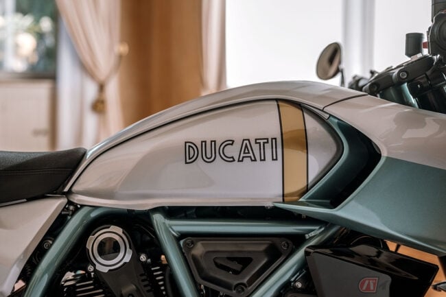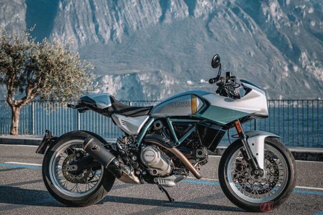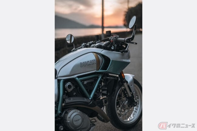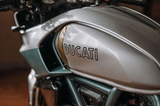 シルバーとアクアグリーンの印象的なカラーリングは、ドゥカティ・スタイル・センターが社内のアーカイブを綿密に調査し、750 Super Sport Desmoのカラースキームを忠実に再現したものです。バーエンドミラーを備えたセパレートハンドルや、短く先細りになったフェアリングとテールが、その唯一無二の個性を際立たせています。さらに、ブレーキやクラッチレバー、リザーバータンク、Rizoma製のフューエルキャップなど、数多くのアルミニウム削り出しパーツを装備することで、その魅力を一層高めています。