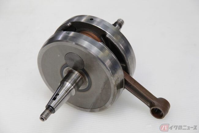 一般的には「クランクシャフト」と呼ばれ、燃焼によって押し下げられたピストンの力をコンロッドを介して受け取り、その往復運動を円運動へと変えます。