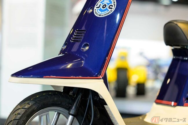 撮影車両は1984年発売モデルで、ブレザー感覚の2トーンカラーが特徴です。大型化したメーターや、ブレーキレバーを握らないとエンジン始動しない安全機構の新採用、ニューパターンのタイヤなどに変更されています。この頃すでに生産台数30万台を超える大ヒットモデルとなっていました。