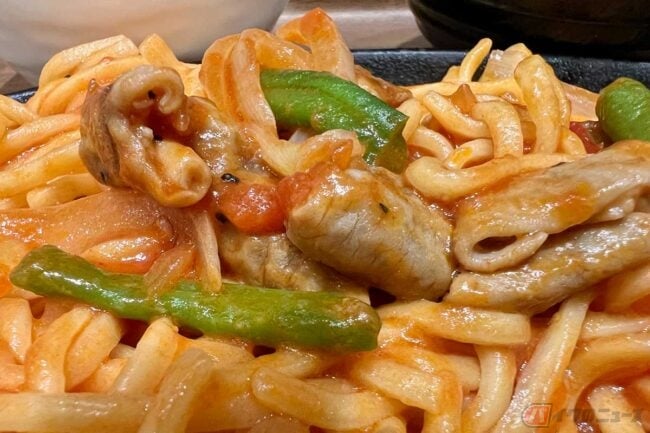 皿の上には懐かしさを感じさせるケチャップ色の太麺パスタに、ピーマンや玉ねぎ、そしてホルモンが絡められています。