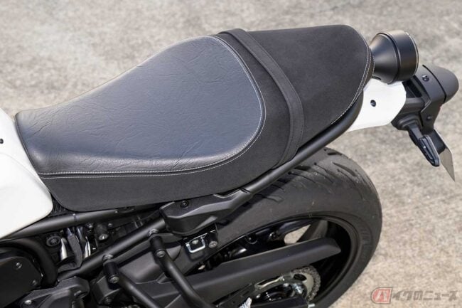 そう、「XSR700」のシートは前方に向かってキュッと絞り込まれた形状になっている。この絶妙なスリムさのおかげで、足がストンと真下に降りるし、サイドスタンドは乗車したままギリギリ払うことができた。