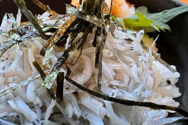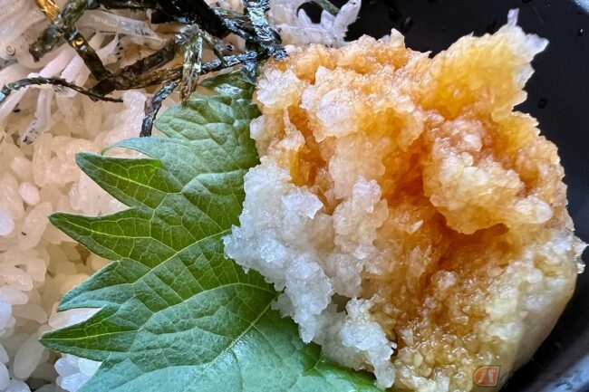 続いてセットのしらす丼をいただきます。ご飯の量は程よく、しらすの塩味が強すぎないため、朝食向きの仕上がりで最後まで飽きずに食べられました。多めの大根おろしに細く切った焼き海苔と大葉が添えられており、全体の印象をさっぱりとまとめてくれます。