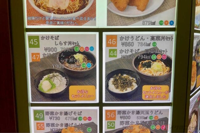 この日は朝ごはんに「かけそば・しらす丼セット」(900円)をオーダーしました。1000円を切る価格設定に加え、カロリーは799kcalと、セットメニューとしてはかなりヘルシーな内容です。