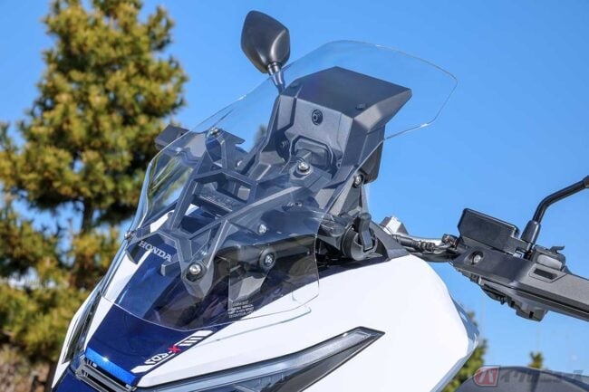 走り出す前にチェックしてほしいのが、フロントスクリーンのこだわり。内側に「X字構造」が見えるメカニカルなデザインが格好いいんだ。左側のツマミで5段階の高さ調整ができるのも、走行環境に合わせやすくて便利。