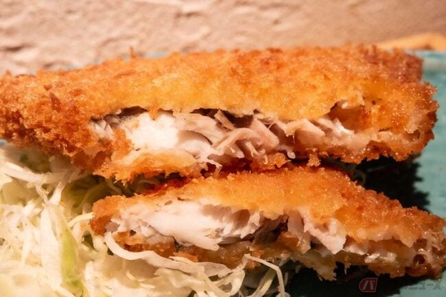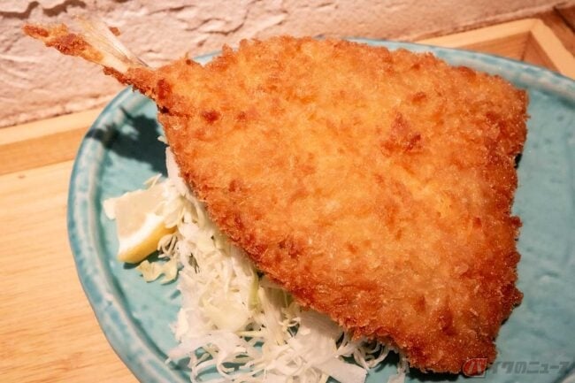 まずはアジフライからいただきます。揚げ色濃いめでサクサク食感。身は締まっていて旨味が強く、鯵の美味しさが引き立つアジフライです。そんなに大きくはないと思いましたが、名前の通り厚みがあって食べ応えがあります。