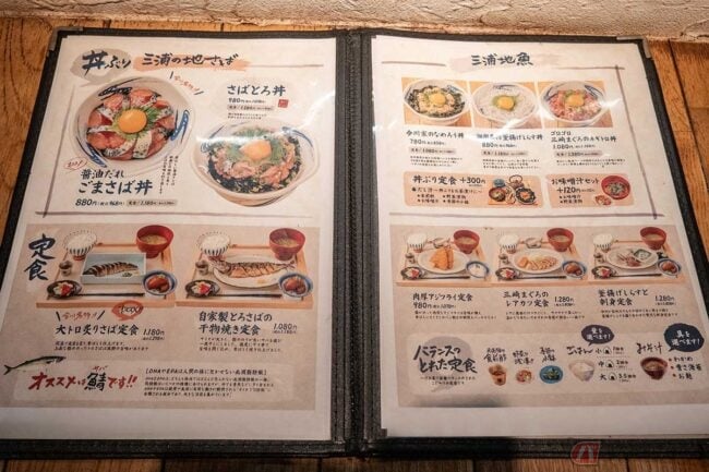 メニューを開くと、まず「ごまさば丼」に「さばとろ丼」が出てきました。どちらも美味しそうです。定食も「鯖」推しですが、アジフライも発見。しかも「肉厚アジフライ定食」です。