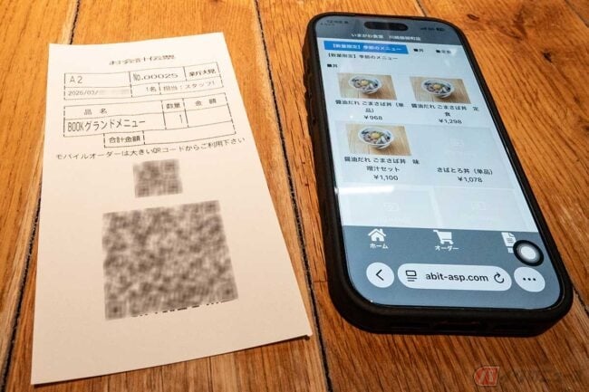 というわけで、「ごまさば丼」に「お味噌汁セット」、単品で「肉厚アジフライ」に決定。スマホでQRコードを読んでオーダーします。
