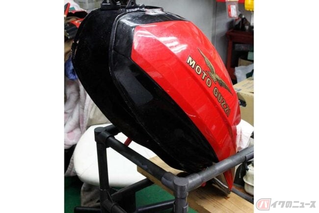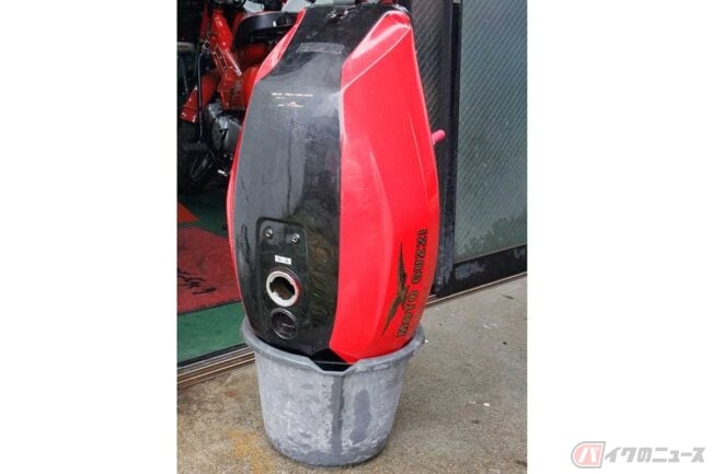 公道復帰に向けて整備中のモトグッツィ「ルマンIII」のタンク内からは、腐敗劣化したガソリンが5Lほど出てきました。30年以上、ガレージ内とは言え放置されていたので、乗らなくなった段階で10Lは残っていたと思われます。