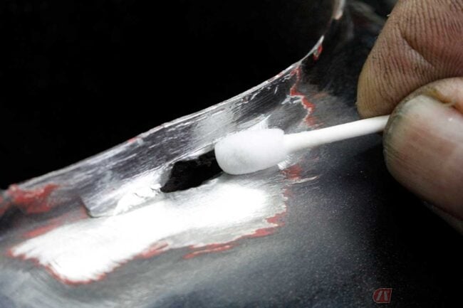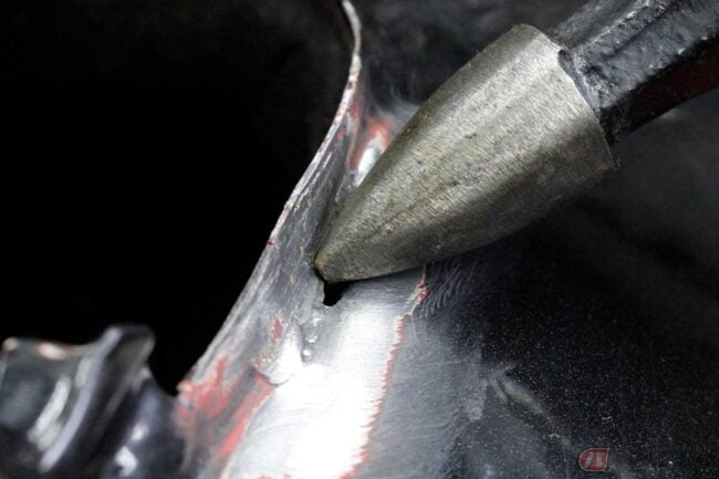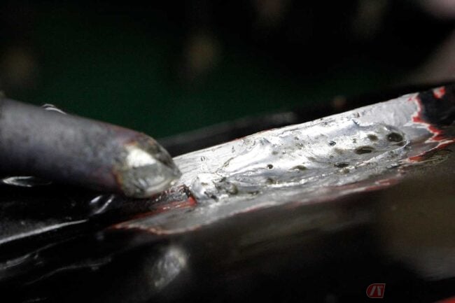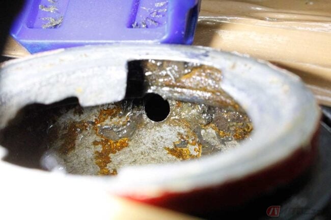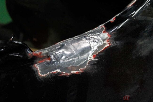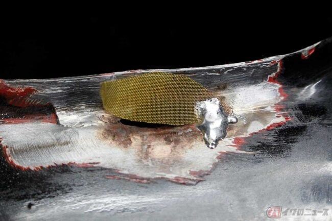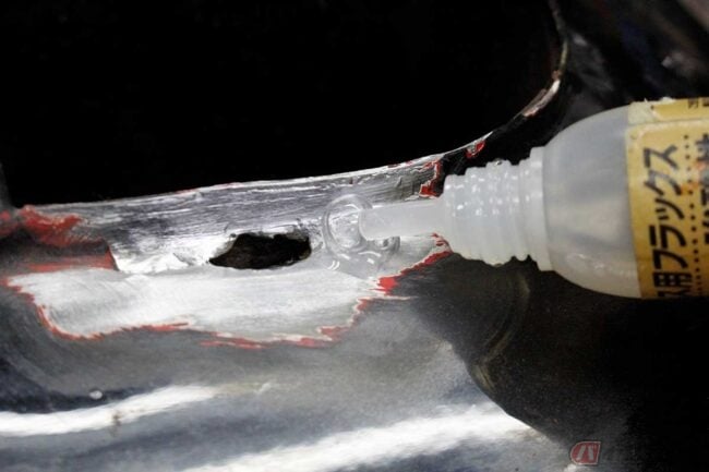 燃料タンク内の汚れを落とすとピンホールから穴へ……溶接部分に起こりやすいサビ穴を板金ハンダで修理!!