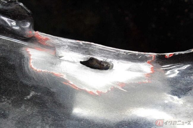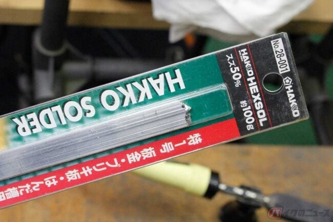 ピンホール周辺は先が尖った検査ハンマーで軽く叩いたことで、2カ所の穴はつながり大きな穴になりました。こうなってしまうと単純なスポットハンダだけでは補修不可能です。