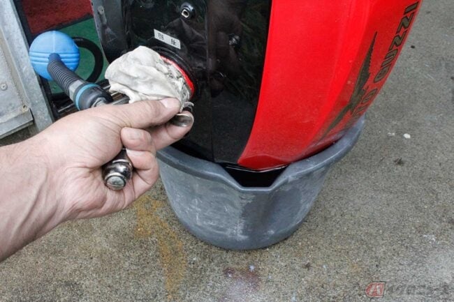 燃料ホースを接続して、キャブレターにガソリンを流し入れたら、念のためにチャンバードレンを緩めて、フレッシュなガソリンが流れていることを目視確認します(1980年代後半以降のモデルでは、環境問題の関係でフロートチャンバードレンが廃止されている例もあります)。