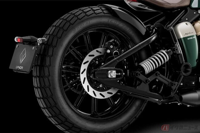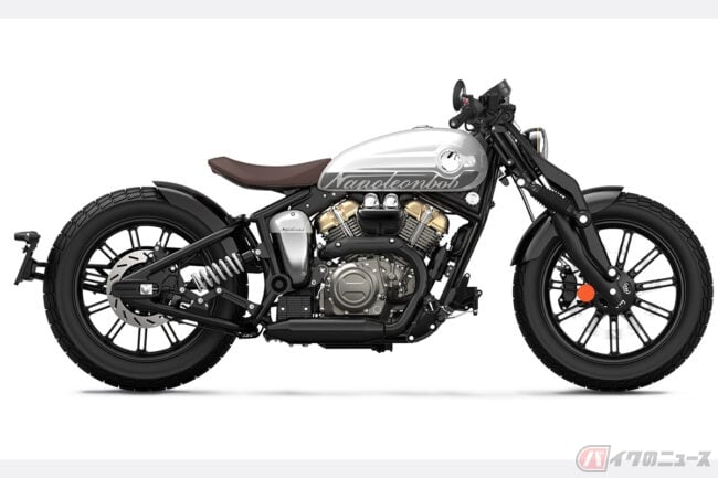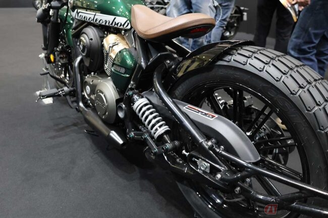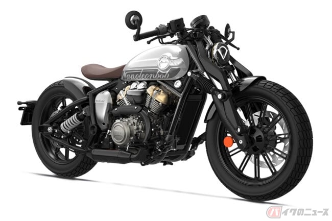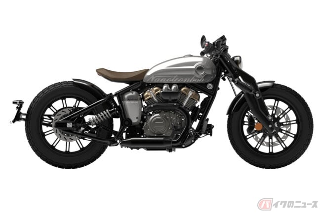 排気量250ccクラスの水冷V型2気筒エンジンを搭載する「ナポレオン・ボブ250」は、750mmのシート高で地を這うようなローアンドロングのシルエットが強調されています。