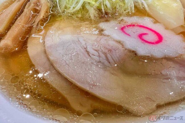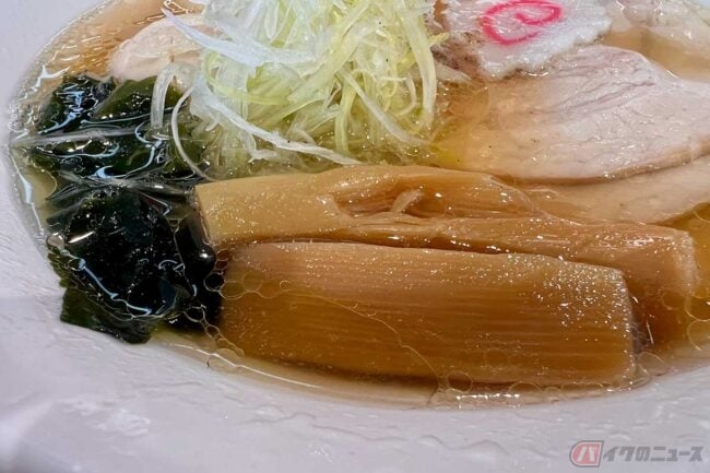 注文したのは「特製佐野らーめん」(1300円)です。澄んだ醤油スープは淡い色合いながら、しっかりとした旨味を感じさせる表情。そこにチャーシュー、ねぎ、わかめ、分厚いメンマ、煮卵、そしてワンタンまで贅沢に盛り込まれています。いわゆる“全部入り”とも言える構成で、まずはそのボリュームに圧倒され、見た目からして満足感の高い仕上がりです。