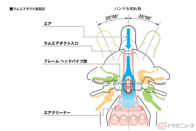 なんだか難しそうですが、すごくザックリ言えば、走るバイク(物体)が気体(走行風)から受ける圧力を利用してパワーを得るのが「ラムエア加圧」のことです。