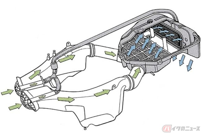 またラムエア加圧するためには、基本的にバイクの正面に向けて大きな口を開ける必要がありますが、これだと雨水やホコリ、飛来する虫などをどんどん吸い込んでしまいます。そのため市販バイクのラムエア加圧では、吸気経路の途中に凹型のポケットを設けるなど吸い込んだ異物を分離していますが、コレも普段使いが大前提の市販バイクではデメリットと言えます。