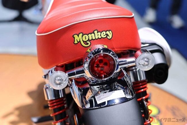 一見して通常のモンキー125と異なるのは、その「佇まい」です。最も象徴的なのは、レッド塗装のフレームとスイングアームで、これにより、エンジン周りのメカニカルな印象が強調され、よりレーシーな印象を与えています。