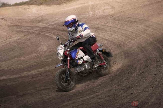 デザインは「ミニトラッカー」というコンセプトのもと、モンキー125をベースにFTRの持つスポーティーでタフなエッセンスと特徴的なホンダ・トリコロールカラーを凝縮しており、エアクリーナーのチェッカーフラッグ柄や、ゼッケンプレート風のヒートプロテクター・フロントバイザーなどなど、ファン垂涎のディテールが随所に散りばめられています。