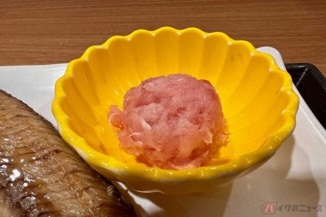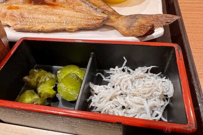 さらに、JAF会員特典として「マグロのたたき(小)」がトッピング無料でした。定食に付け合わせの「しらす」と合わせてご飯の上にオンすれば、即席のミニ海鮮丼が完成です。干物定食に加えてこの1杯が楽しめるのは、ちょっとした裏技的な楽しみ方で、満足感がいっそう増しました。