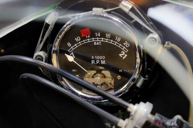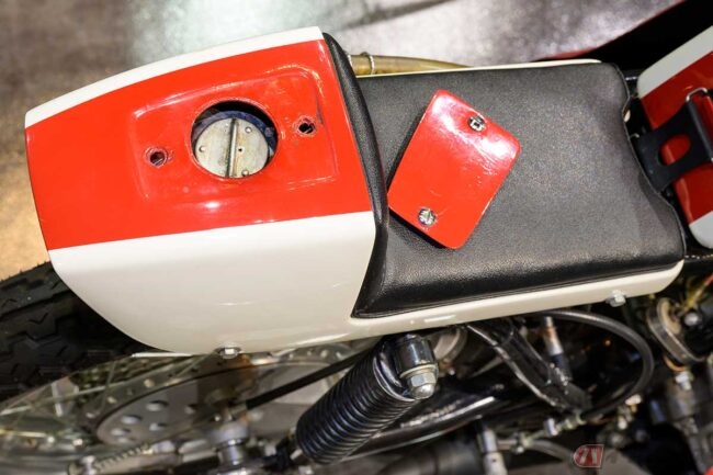 現在のヤマハのコーポレートカラーはブルーですが、「RD56」の白のカウルや燃料タンクの中央に引かれたにスカーレット(赤)ラインも、精悍で独特の爽やかさを感じさせる美しさがあります(緑色のゼッケンは当時の250ccクラスを示す指定色)。