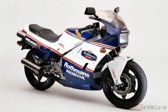 そして同年にワークスマシン「NS500」を彷彿とさせる2ストロークV型3気筒エンジンを搭載する「NS400R」が発売されますが、赤×白×青のトリコロールカラーと共に、ロスマンズカラーがラインナップされました。