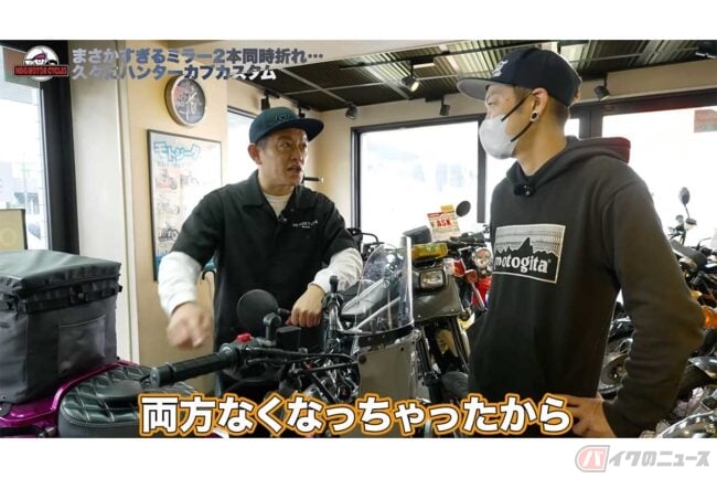 当然そのままでは走れないため、バイクショップ「moto GITA」の椎木さんにクルマで運んでもらい、「両方のミラー折れてバイク屋来る人、います?」と聞くと、「いや、ほぼいないですね」と即答。