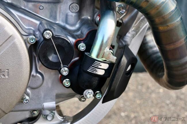 操作系では、ハンドガードを装着するなどエンデューロに近い装備ですね。また、ステム部分にアフターパーツを使用してキャスター角を調整し、接地感を高めるといった工夫もしています。こうした細かな変更によって、アスファルトでの安定性や操作性を高めています。