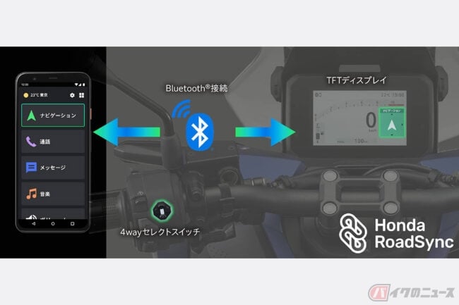 Honda RoadSyncは、車両とスマートフォンをBluetoothで接続することで、ハンドルのセレクトスイッチや別売りのヘッドセットによる音声入力で、音楽再生やナビゲーションなどのアプリ操作を可能にする機能です。メーター画面に情報を表示できるため、運転中の視線移動を少なくできます。
