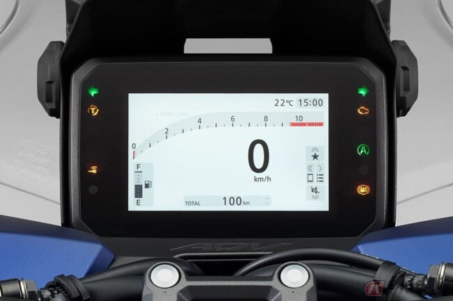 外観は、車体前部側面のカバー形状が変更され、よりアクティブでどこにでも出かけたくなるようなアドベンチャースタイルに磨きがかけられました。フロントまわりは、パーツを分割して構成することでメカニカルな密度感を追求。デュアルLEDヘッドライトとエッジの効いたカウルが、タフな個性を主張します。また、2段階に調節可能なスクリーンは、高い防風性能に寄与します。