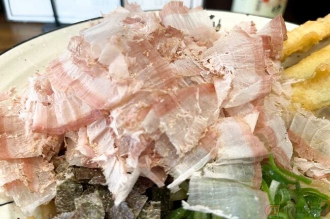 「焼津ぶしうどん しょうた」のうどんには色々な特徴があります。麺はきしめん的な平打ち麺でコシが強く、天ぷらも揚げたて。そして焼津産の鰹節がたっぷりトッピングされます。この鰹節も削りたてなんです。