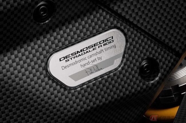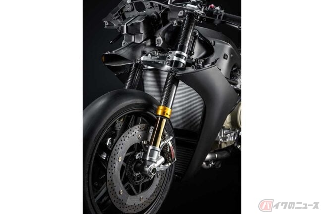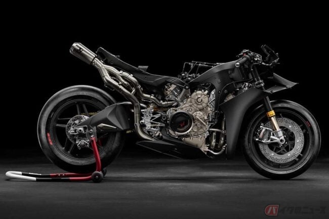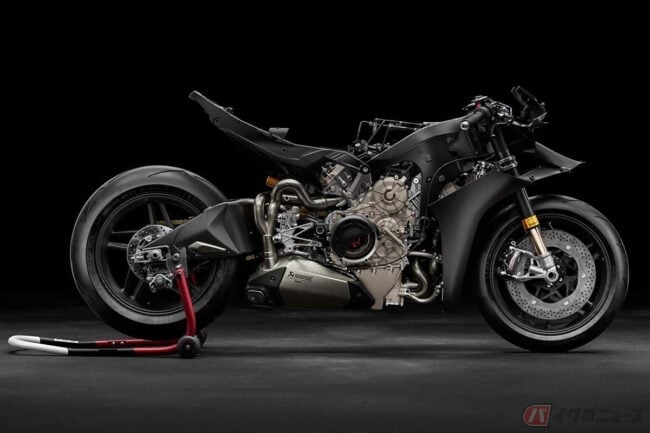 最高出力228hp(サーキット仕様で最大247hp)を発揮する排気量998ccのV4エンジン(デスモセディチ・ストラダーレR1100)が搭載され、フレーム、サブフレーム、スイングアーム、フロントフォークのアウターチューブ、ホイールなどフルカーボンファイバー構造となっており、Brembo製カーボンセラミックブレーキディスクを装備します。