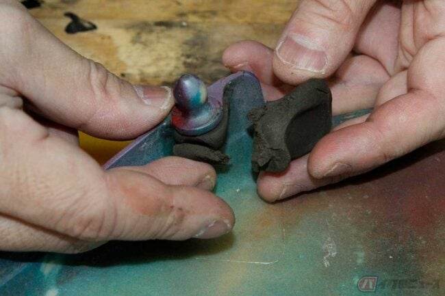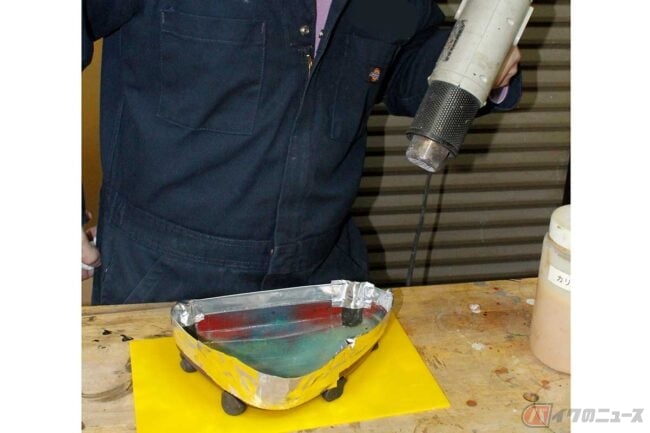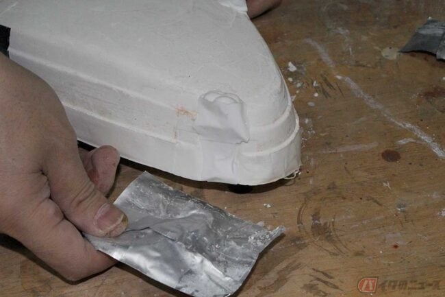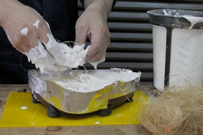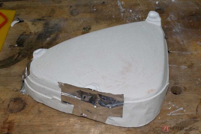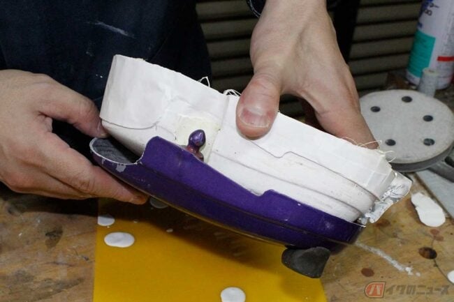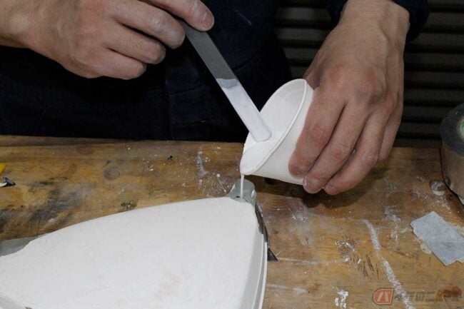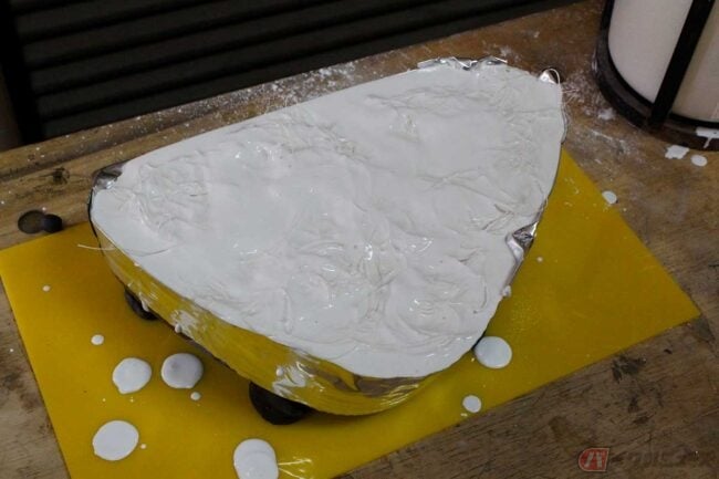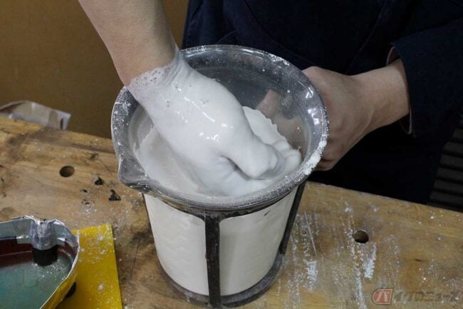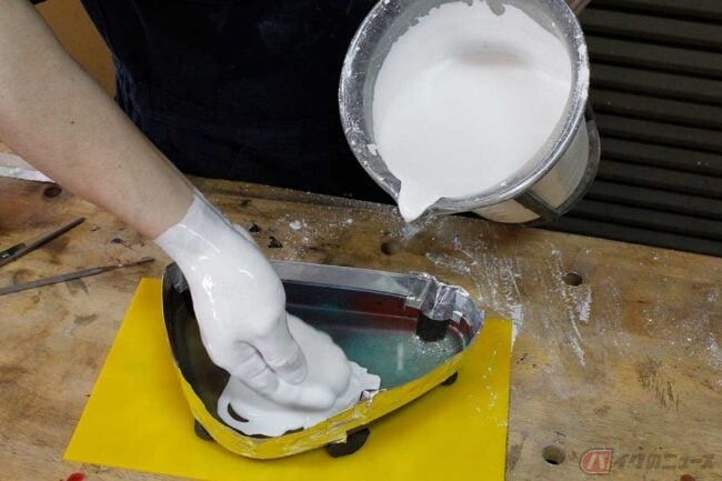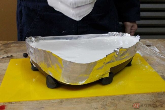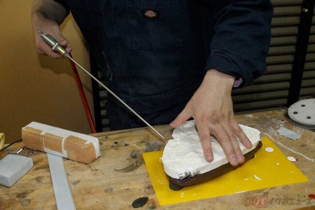ここでの作業画像は、ABS製素材板を成形するための段取り、「型作り工程」になります。過去にFRP成形用の型作りは見たことがありましたが、なんとここでは「石膏(せっこう)」を利用します。
