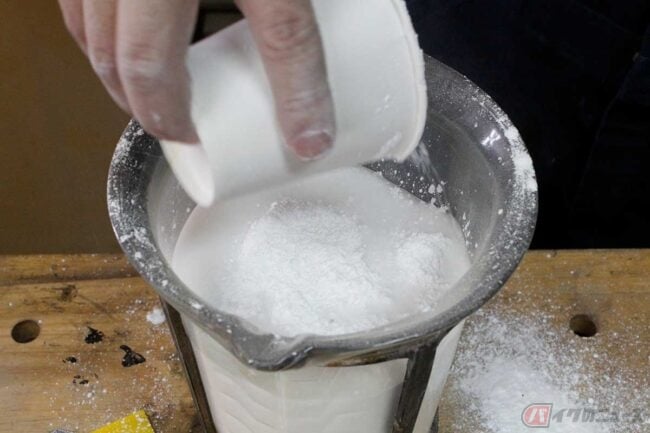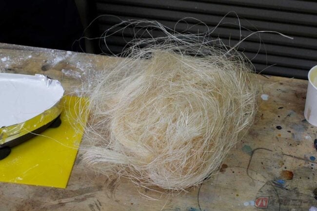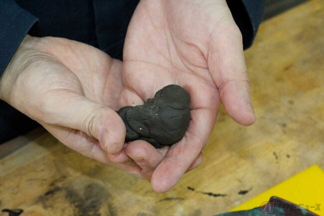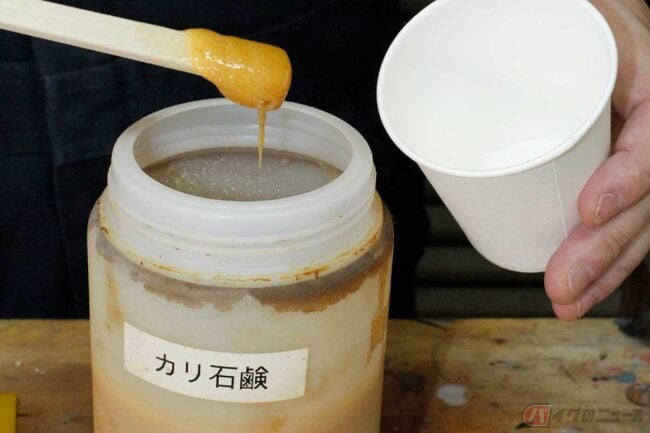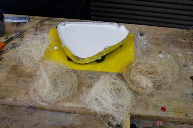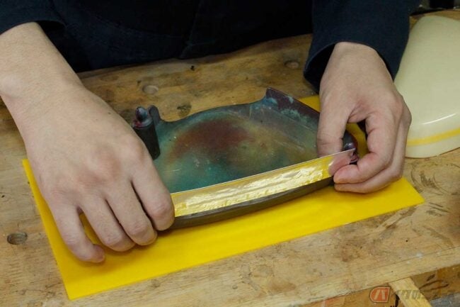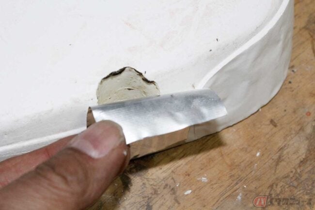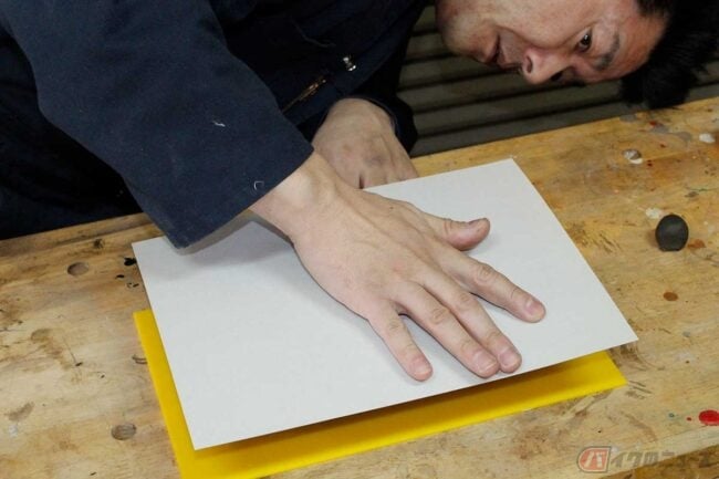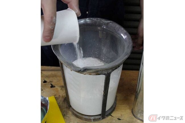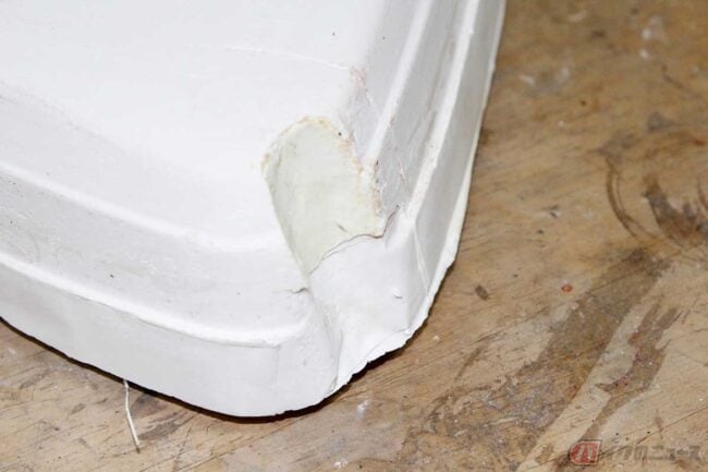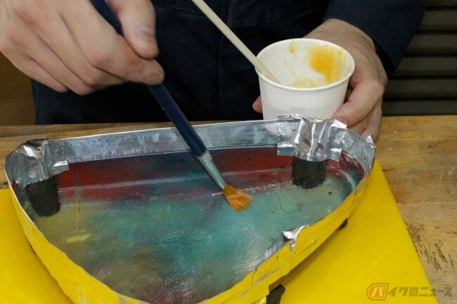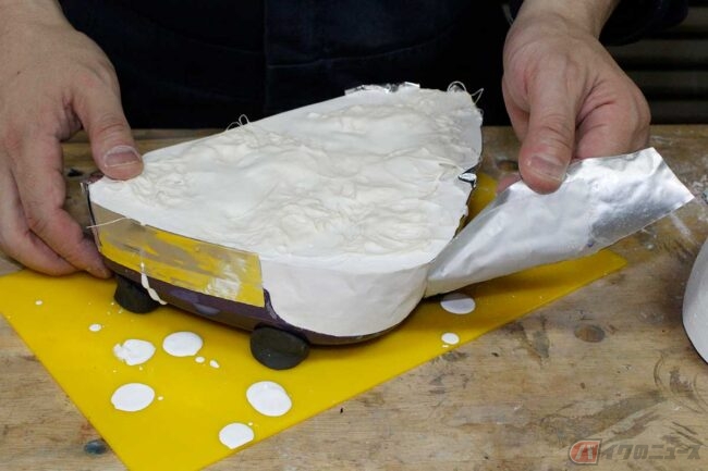 ここでの作業画像は、ABS製素材板を成形するための段取り、「型作り工程」になります。過去にFRP成形用の型作りは見たことがありましたが、なんとここでは「石膏(せっこう)」を利用します。