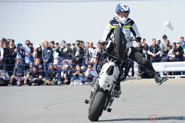 日本では数少ないバイク・スタント。約10分間の解説では、バイク・スタントを可能とするもう1つのポイントであるスタント・カスタムについても言及。名古屋モーターサイクルショーの来場者を釘付けにしました。