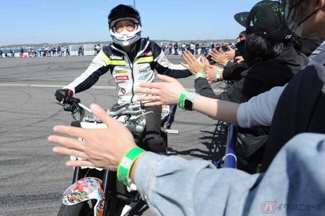 最後は、バーンアウトで後輪から白煙を上げて、会場を囲む観客とハイタッチ。3日目のパフォーマンスでは30分の予定を10分延長して観客の声援に応えました。