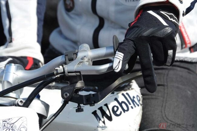 ライダーは通常、シートに座ってスロットルやメーターが見られる位置で運転しますが、小川さんのこのポジションでは、ハンドルより前に身体があり、後ろ手でアクセルとブレーキを操作します。