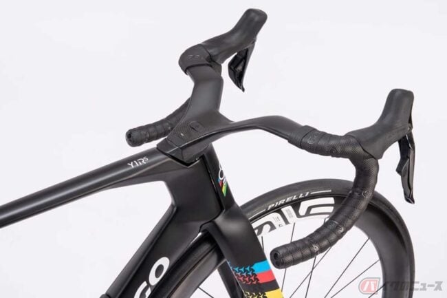 ワールドツアーの高速域で真価を発揮することを前提に開発された「Y1Rs」最大の特徴は、従来のロードバイクの常識を覆すフロント周りの設計にあります。